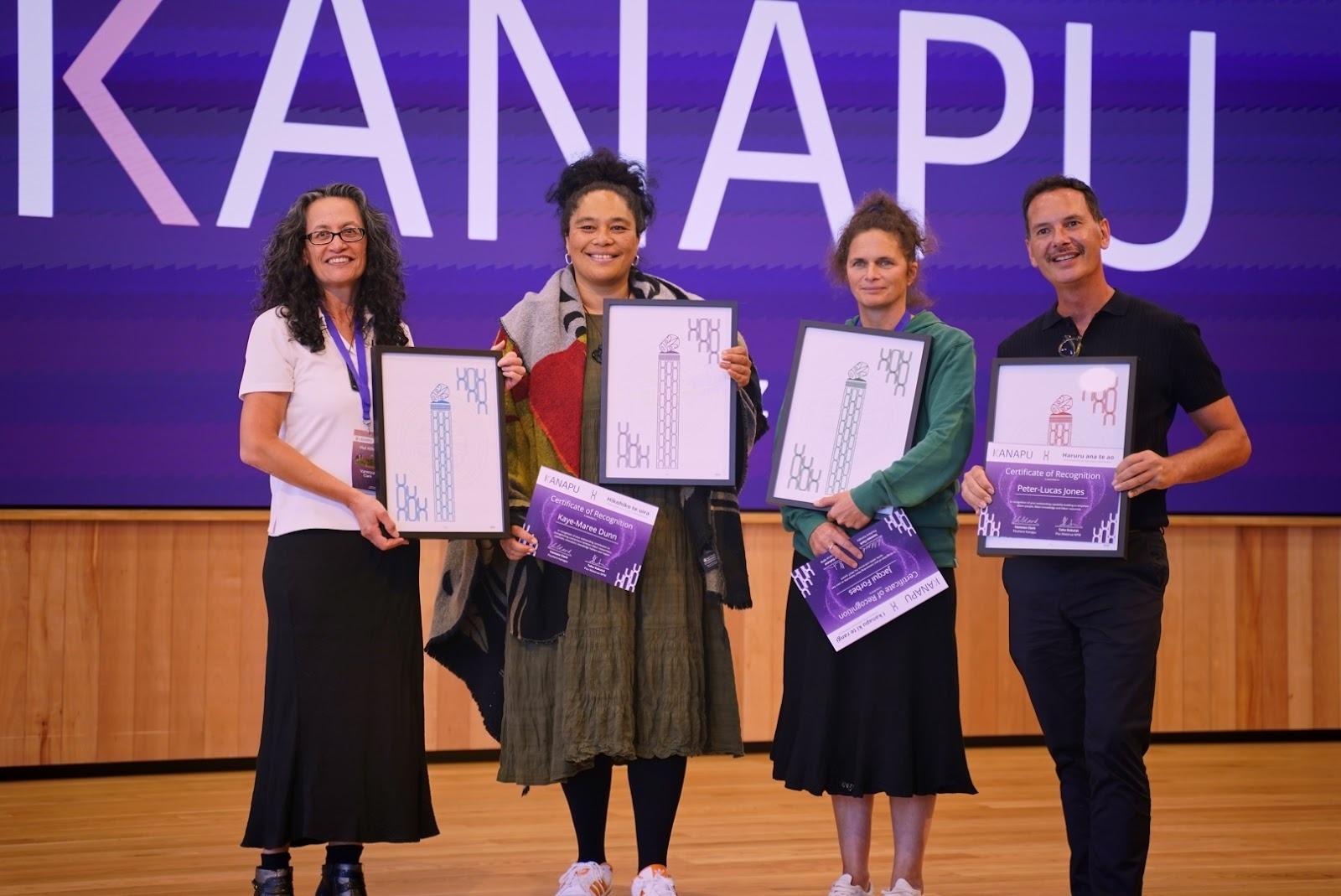 Pictured from left to right: Vanessa Clark on behalf of Anne-Marie Jackson, Kaye-Maree Dunn, Jacqui Forbes and Peter-Lucas Jones Each person received an award representing one of the four pou of Kanapu. Tohu created by Tukaroto Mahuta. Source - https://kanapu.maori.nz/nga-tohu-kanapu/